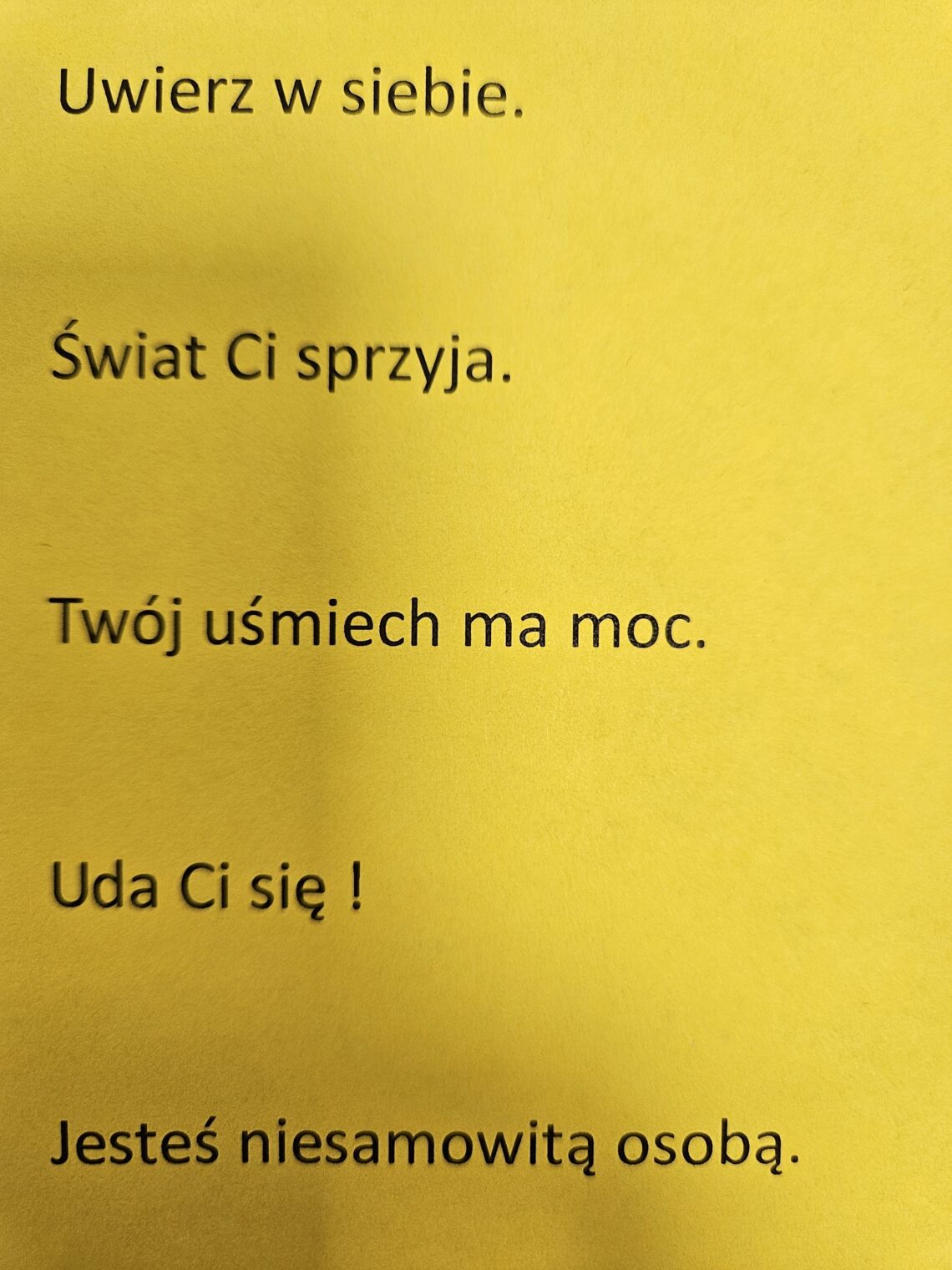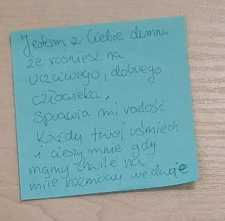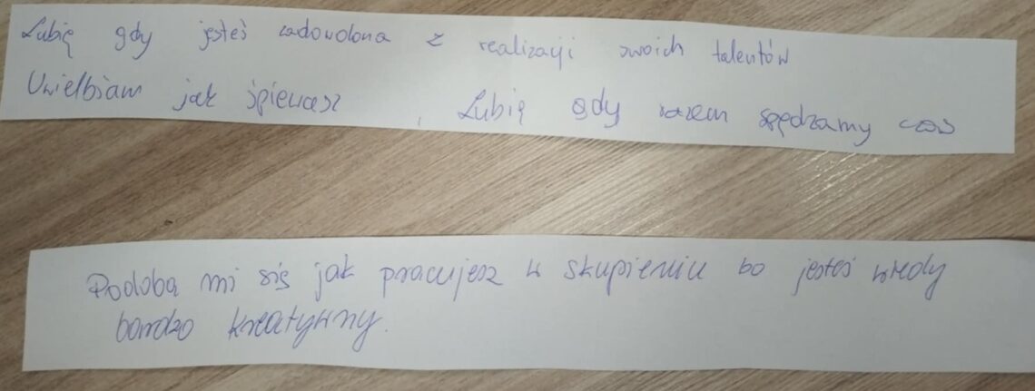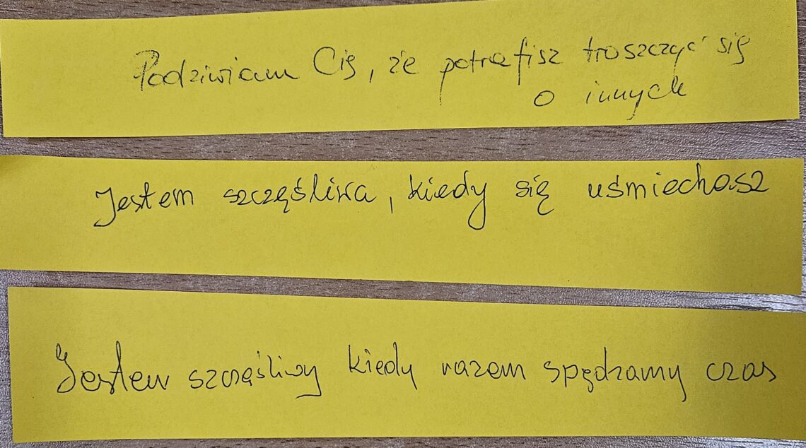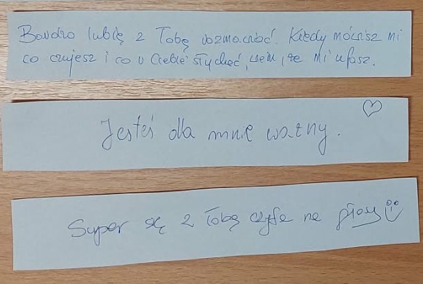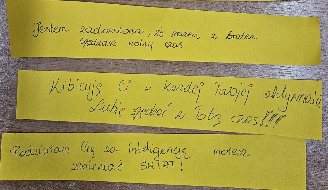 Nauczyciele podczas spotkań z rodzicami poprosili ich o docenienie własnych dzieci, o zauważenie mocnych stron swoich pociech w formie pisemnej na kartkach. Następnie rodzice mieli przekazać dzieciom karki w domu.